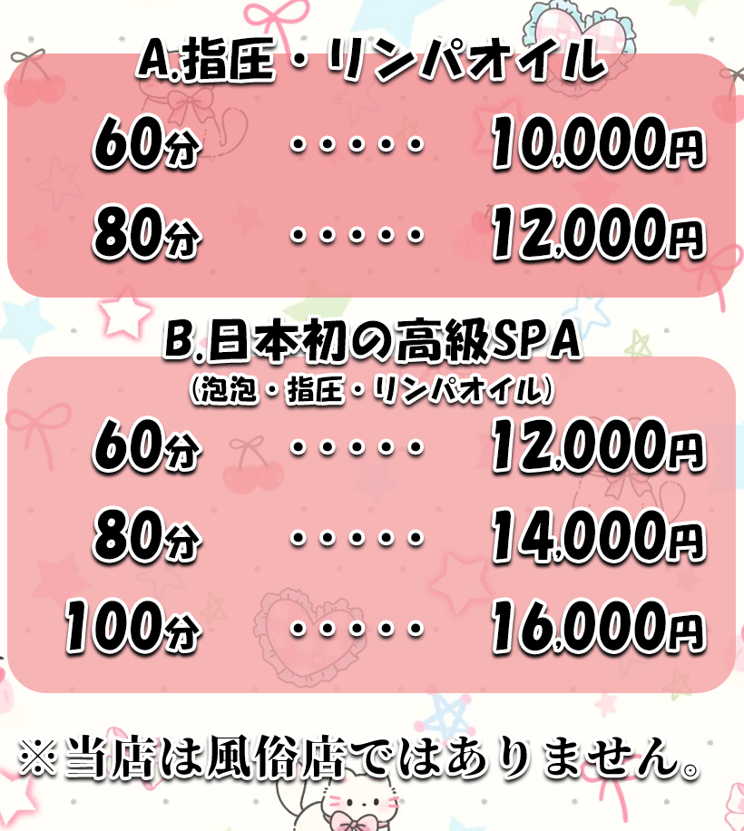 当店では、アロマオイルの効能と当店自慢のセラピストによるリンパマッサージの相乗効果による、癒しのひとときをお客様お一人お一人にお届けしております、自然で心やすらぐ優美な香りを、施術中はもちろんご帰宅お休みになってから翌日朝目覚めでまで楽しんで頂けます、どうぞゆっくりご堪能ください。